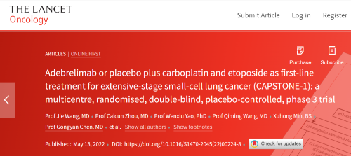 北京时间2022年5月14日,PA视讯医药自主研发的PD-L1抑制剂阿得贝利单抗治疗广泛期小细胞肺癌的III期临床研究(CAPSTONE-1研究)成果正式全文在线发表于国际权威学术期刊《柳叶刀·肿瘤学》(《THE LANCET Oncology》,影响因子41.316)。CAPSTONE-1研究结果显示,阿得贝利单抗联合化疗一线治疗广泛期小细胞肺癌相较于安慰剂联合化疗可以显著延长患者总生存期至15.3个月[1],刷新现有免疫药物一线治疗广泛期小细胞肺癌的总生存纪录[2]。