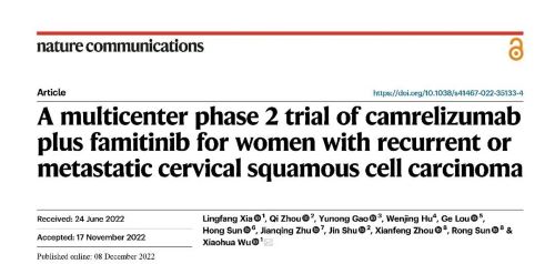 [1] Xia, L., Zhou, Q., Gao, Y. et al. A multicenter phase 2 trial of camrelizumab plus famitinib for women with recurrent or metastatic cervical squamous cell carcinoma. Nat Commun 13, 7581 (2022). https://doi.org/10.1038/s41467-022-35133-4.