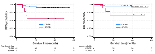 12W时获得完全缓解和部分缓解(CR+PR)的患者,2年PFS率达到90.2%(95% CI:76.1-96.2),12W时疾病稳定和疾病进展(SD+PD)的患者2年PFS率为55.6%(95% CI:20.4-80.5)(P<0.05)。12W时CR+PR患者的2年OS率为95.1%(95% CI:81.9-98.8),12W时SD+PD患者2年OS率为66.7%(95% CI:28.2-87.8)(P<0.05)。