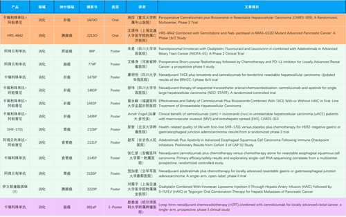 在消化系统肿瘤领域,PA视讯产品相关研究共入选2项口头报告、11项壁报和1项电子壁报,共14项研究。除卡瑞利珠单抗和阿帕替尼外,还有4篇阿得贝利单抗治疗消化系统肿瘤研究入选。HRS-4642、瑞拉芙普-α注射液(SHR-1701)等在研创新产品也有相应研究亮相。另有1项伊立替康脂质体(II)用于胰腺癌治疗的研究入选壁报。
