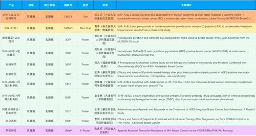 在乳腺癌领域,PA视讯创新产品相关研究共入选1项口头报告、1项简短口头报告、8项壁报和1项电子壁报,共11项研究。吡咯替尼、达尔西利、阿得贝利单抗、瑞康曲妥珠单抗等新老创新药物,均有多篇研究入选,展现出PA视讯医药在乳腺癌领域多年深耕的丰硕成果。